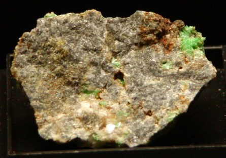 ギリシャ産のニッケル華を見つけました。左の写真、右上の緑色結晶がニッケル華 です。左の写真では小さすぎて判別しづらいので、右に拡大した写真を載せておき ます。拡大してもよく分からない小さな結晶ですね(^-^; 右の写真の中央部分から 放射状に結晶したようです。長さは約3mm。この裏側にも1mm以下の小さな放射状 結晶がいくつか付いてますが、小さ過ぎて綺麗に撮れないので、その写真は載せま せん。ニッケル華はコバルト華の親戚で、ニッケルとコバルトが任意の割合で混ざ ります。両者の中間体も存在するとの事ですが、僕はまだ見たことがありません。 ニッケル華はその名前通り、ニッケル鉱床の酸化帯に咲く花のように見える事から 名付けられました。特徴は何と言ってもこの鮮やかな『緑色』です。緑鉛鉱の緑を 更に鮮やかにした感じですかね。ホントにいい色してます♪最後に大きさですが、 母岩全体で25×32×19mm程になります。